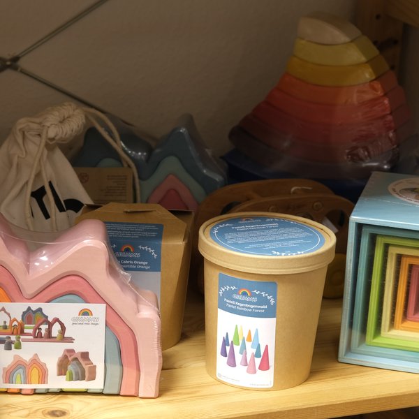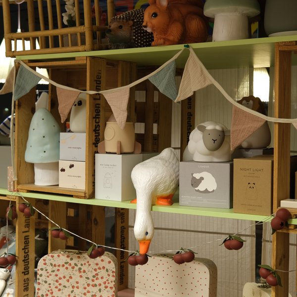 Holzspielzeuge, die zum kreativen Spiel anregen, Kuscheltiere, die nicht nur Kinder zum Strahlen und Schmunzeln bringen oder auch ein Beißring, der die Kleinen beim ersten Zahn unterstützt. Marken, die wir lieben:Djeco, Grimms, Jellycat, Oli&Carol, Sebra